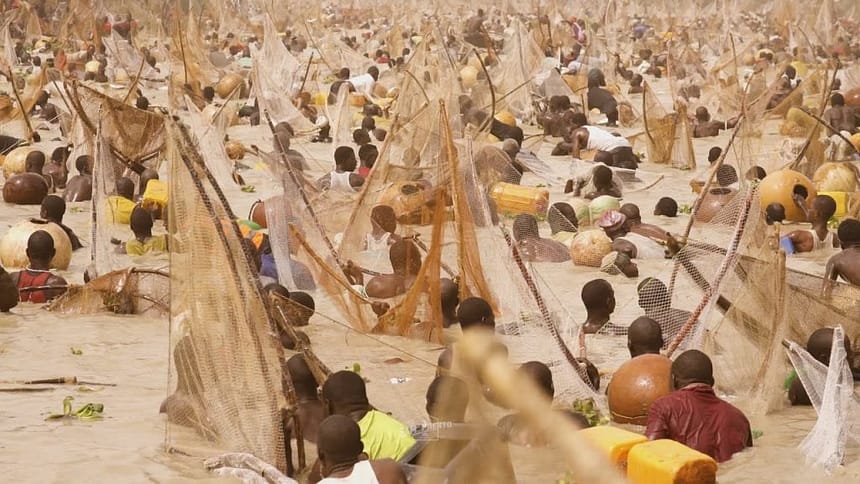 The excited fishermen, dressed in traditional attire and carrying nets and calabashes, entered the river ahead of the official start of the competition.