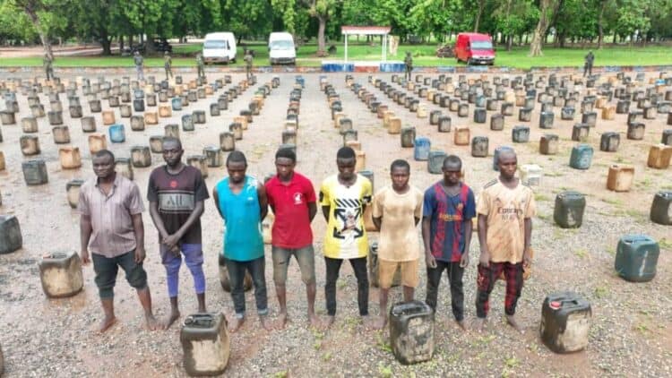 The suspects identified as Jafaru Adamu (32 years), Auwal Haruna (34 years), Umar Dahiru, Mubarak Abdullahi (20 years), Saidu Musa (26 years), Bashiru Ibrahim (18 years), Danlami Yahuaza (19 years), and Abubakar Abdullahi (19 years), were caught en route the border with a large quantity of fuel.