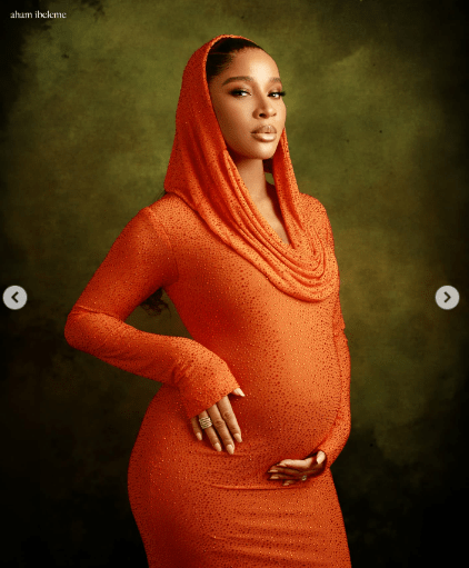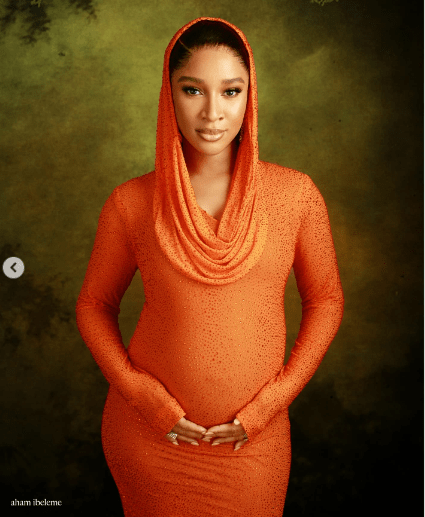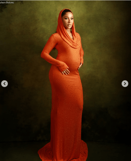 In the photos, Adesua looked radiant in a vibrant orange dress with a hood, lovingly cradling her baby bump as she celebrated the special moment with her fans.