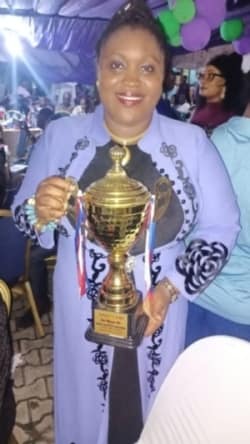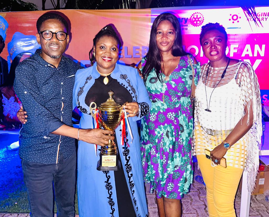 2022-23 President of Rotary Club of Ikeja-Alausa Central, Rotarian Adebukunola Soile-Balogun with one of the trophies won by the club