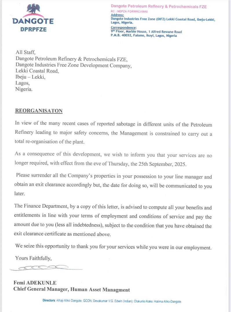 According to a memo dated 25 September 2025, and signed by the Chief General Manager of Human Asset Management, Femi Adekunle, the companies said that the decision was taken as part of a ‘total re-organisation’ following ‘many recent cases of reported sabotage in different units of the petroleum refinery leading to major safety concerns’.