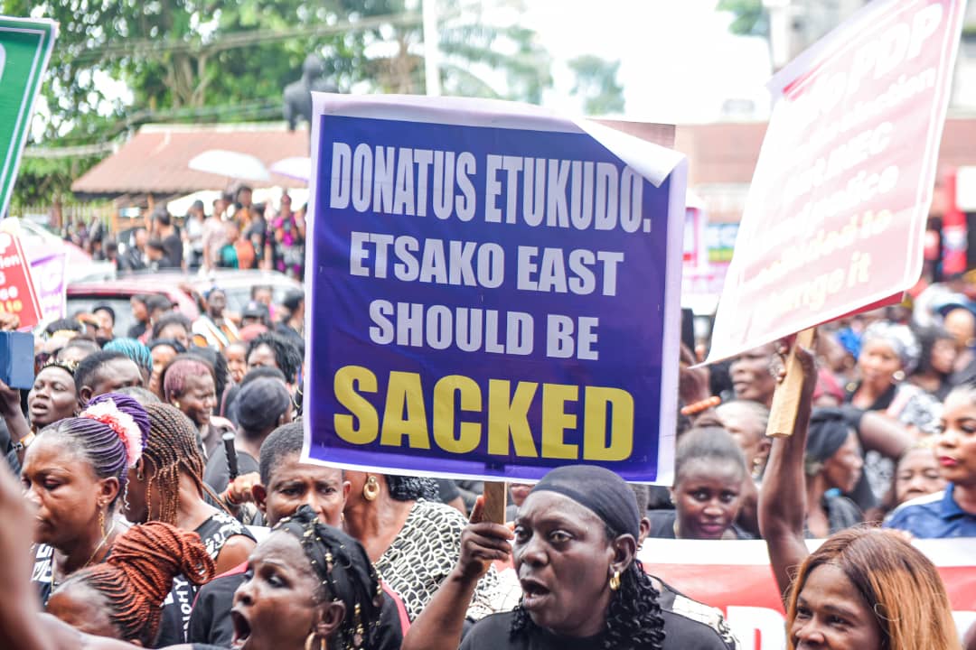 The Peoples Democratic Party (PDP) women, fully dressed in black attire, on Tuesday stormed the streets of Benin City, capital of Edo State in their thousands to protest and express their dissatisfaction with the Independent National Electoral Commission (INEC) over the conduct of the 21 September governorship election in the state.