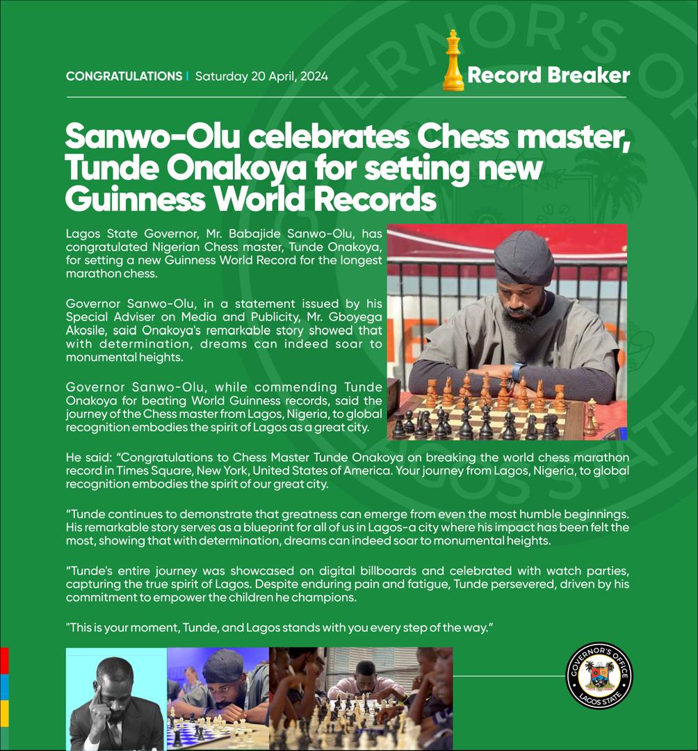 While commending Onakoya for beating GWR, Sanwo-Olu said that the journey of the Chess master from Lagos, Nigeria, to global recognition embodies the spirit of Lagos as a great city.