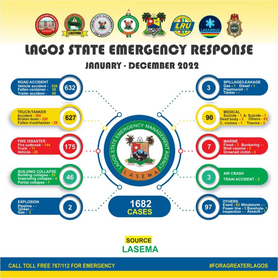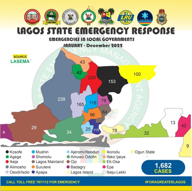 Lagos State Emergency Management Agency (LASEMA) attended to 1,682 disasters or emergencies in the just ended year, as against 1,743 in 2021, according to data it released.