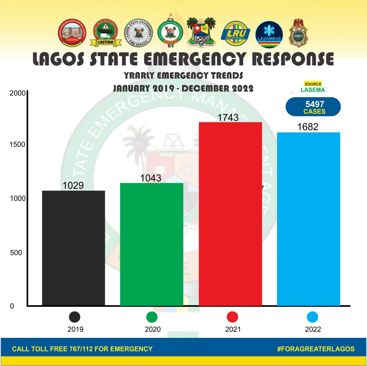 In the last four years, collated data has revealed that LASEMA attended to 1,029 incidents in Y2019, 1,043 incidents in Y2020, 1,743 incidents in Y2021 and 1,682 incidents in Y2022.