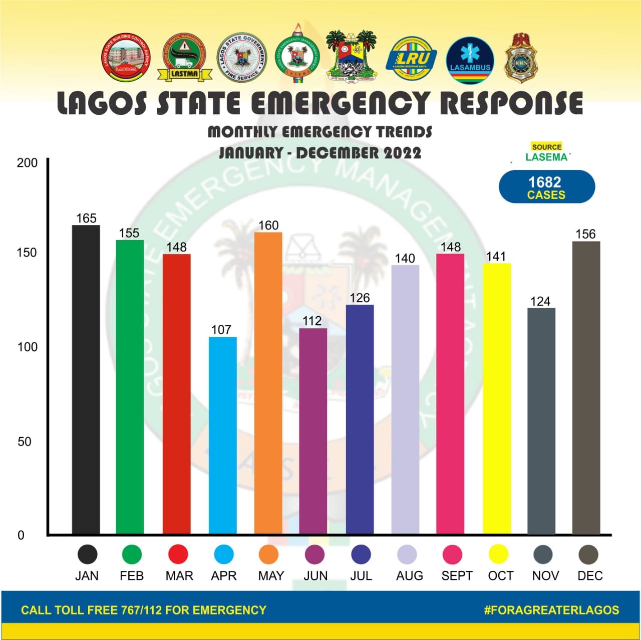 Oke-Osanyintolu further analysed the data for 2022, explaining that out of the 1,682 incidents which the agency attended to, January has the highest (165), followed by May (160), December (156), February (155), while March and September each recorded 148.