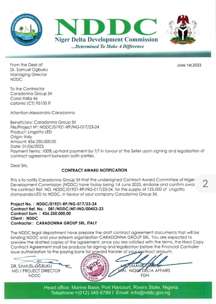 1. Contract awards in NDDC follow due process stipulated by the Procurement Act. At the end of that process, the successful bidder is issued an award letter signed by the Director of Procurement. That award letter is on a security paper, with a serial number and a QR code. Contract award letters do not come from the desk of the managing director.