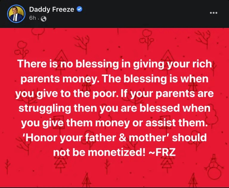 Taking to Facebook, he wrote: “There is no blessing in giving your rich parents money. The blessing is when you give to the poor. If your parents are struggling then you are blessed when you give them money or assist them. ‘Honor your father & mother’ should not be monetized”!