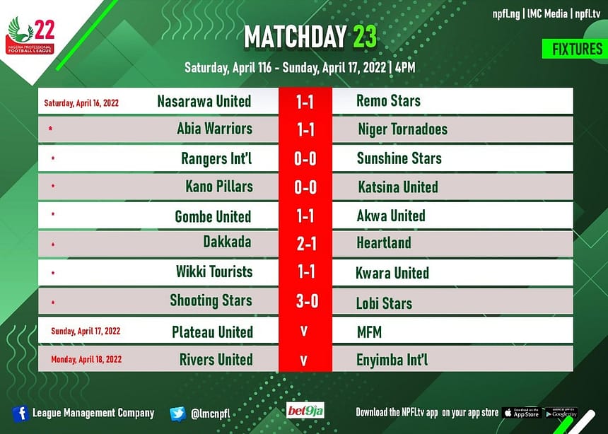 Saturday’s results: Gombe United 1-1 Akwa United, 3SC 3-0 Lobi Stars, Kano Pillars 0-0 Katsina United (TBC), Rangers 0-0 Sunshine Stars, Abia Warriors 1-1 Tornadoes, Wikki Tourists 1-1 Kwara United, Dakkada FC 2-1 Heartland, Nasarawa United 1-1 Remo Stars