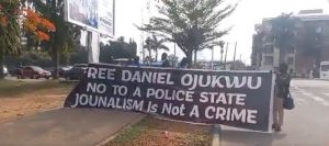 The protesters were seen carrying banners with the inscriptions, ‘Free Daniel Ojukwu’, ‘No to a police state’, Journalism is not a crime’, and ‘Stop the impunity’.