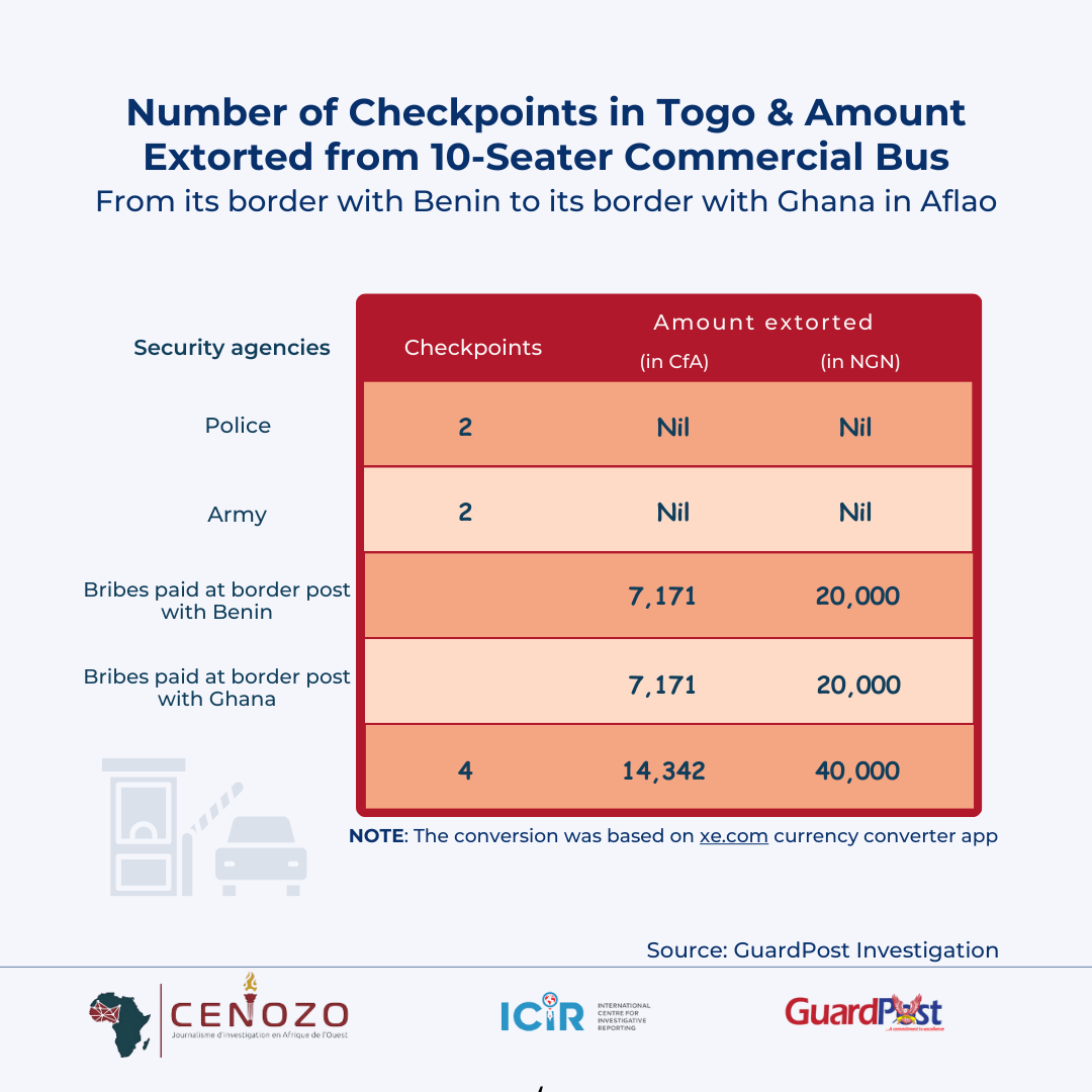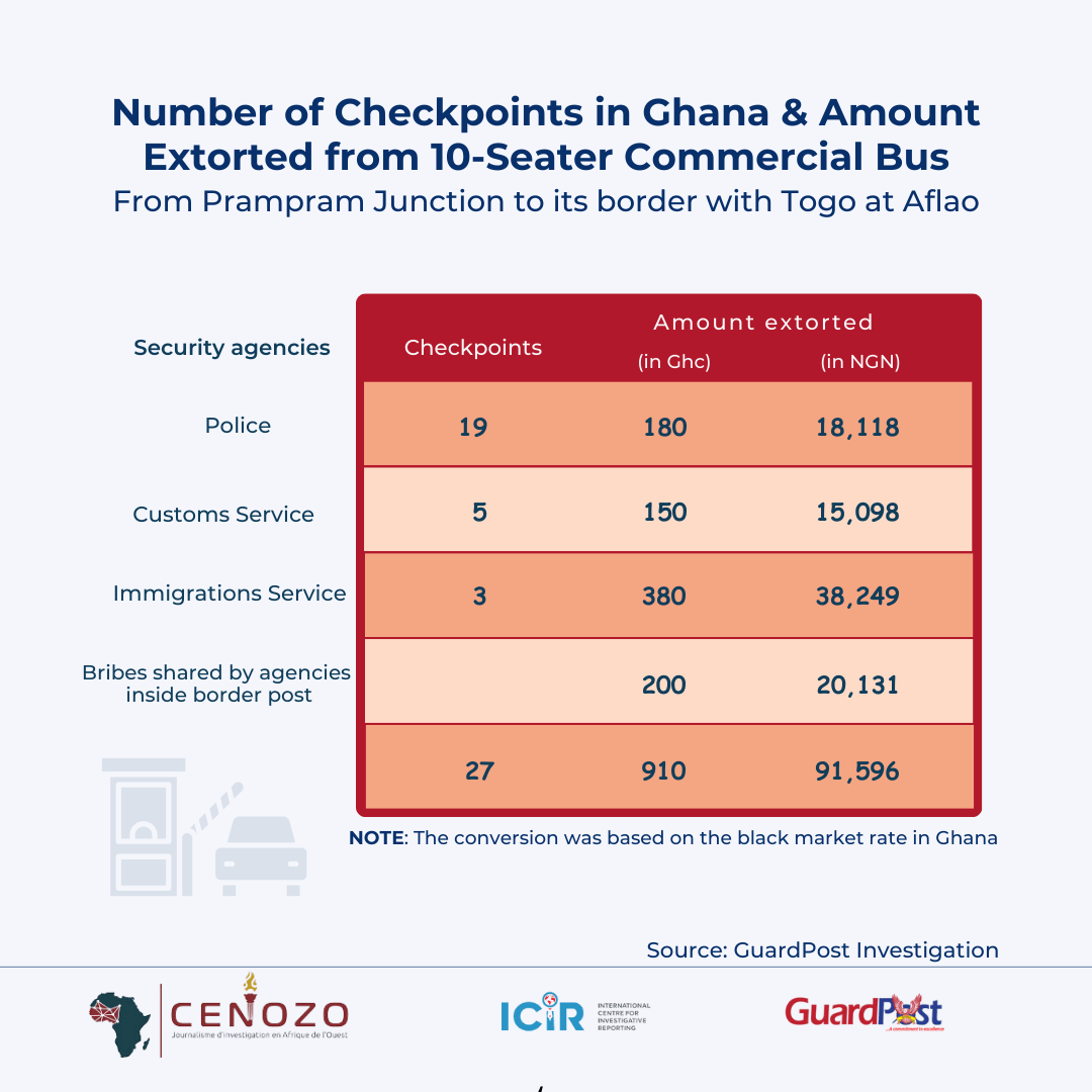 Our investigation revealed a stunning amount of money being extorted from commercial buses traveling between Lagos and Accra. Each 10-seater bus trip results in an estimated N253, 596 in unlawful revenue. The rate becomes much higher for a 20-seater luxury bus, with over N507,192 extorted for each trip.