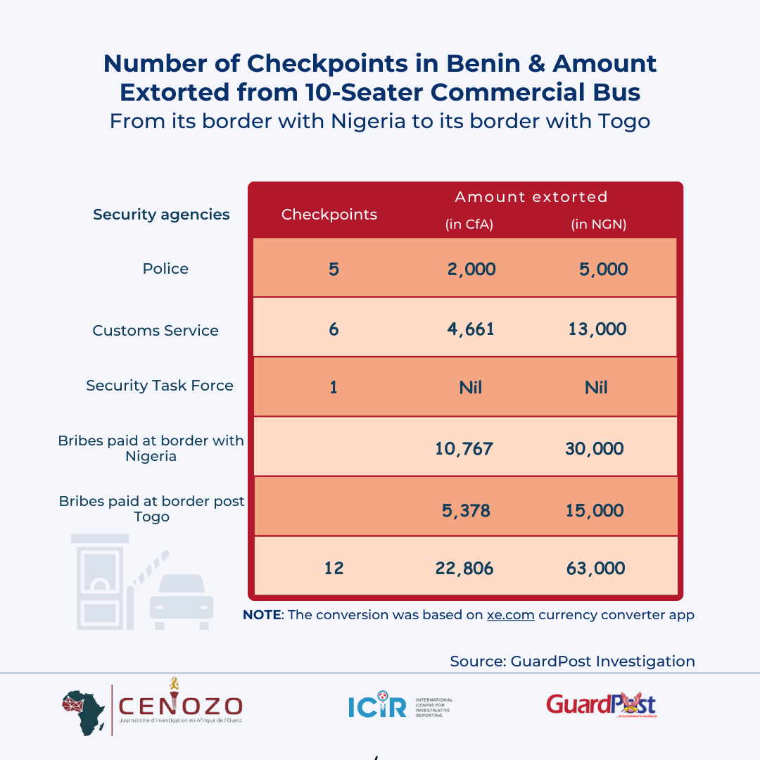 Chat 3 shows the number of checkpoints from Benin Republic’s border with Nigeria to its border with Togo and the amount extorted from a 10-seater commercial bus passing through the country. The conversion was based on xe.com currency converter app