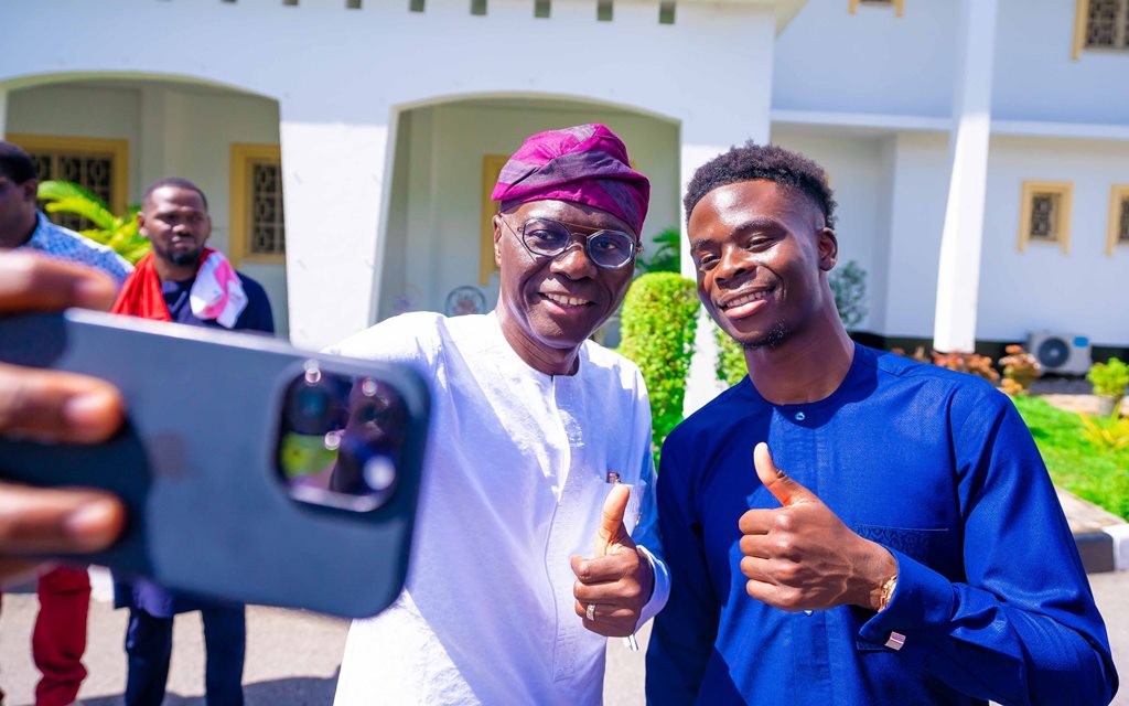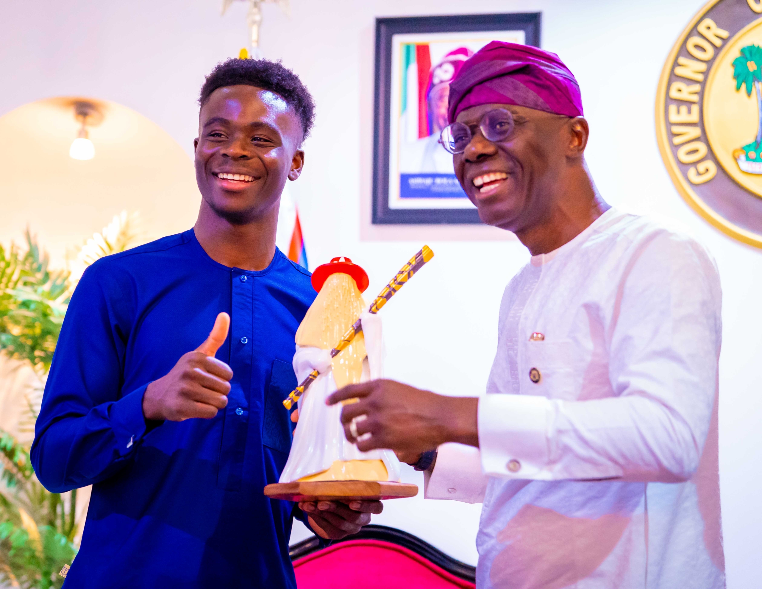 Lagos State Governor, Mr. Banajide Sanwo-Olu on Saturday received Arsenal winger, Bukayo Saka at the Lagos House in Marina.