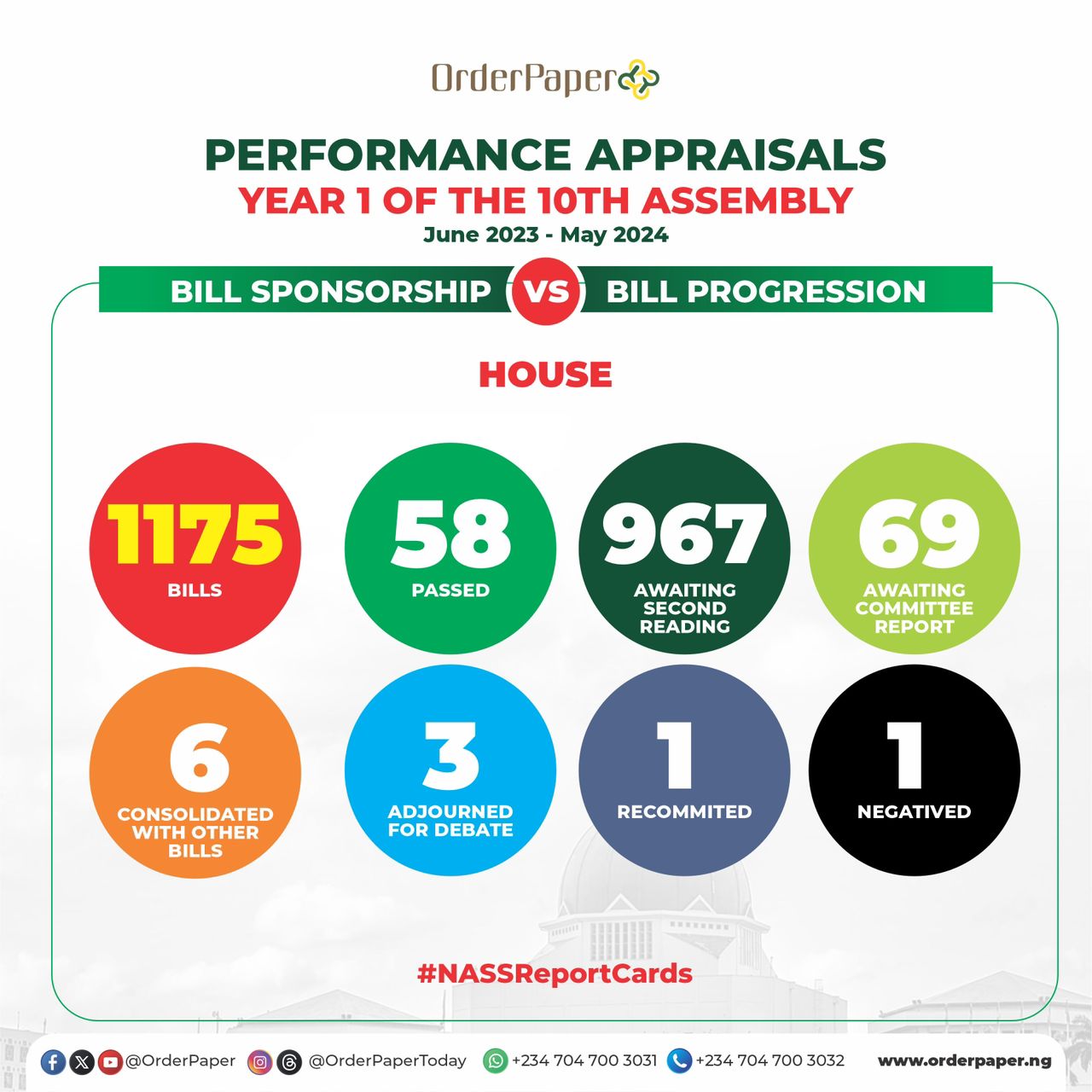 In like manner, out of 1,175 bills introduced in the House of Representatives in the same period under review, only 58 have been passed while a vast majority of 967 are awaiting second reading.