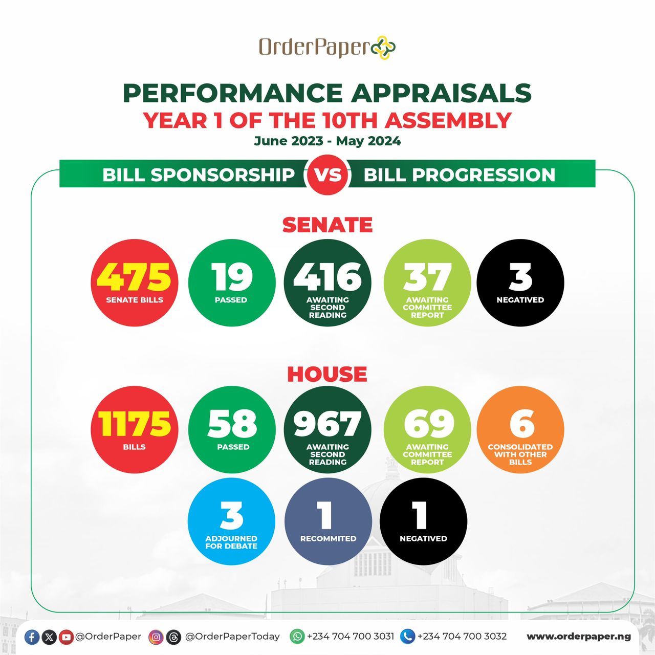 The analysis by OrderPaper shows that from June 2023 to May 2024, the Senate introduced a staggering 475 bills out of which only 19 have been passed while 416 remain stuck awaiting second reading.