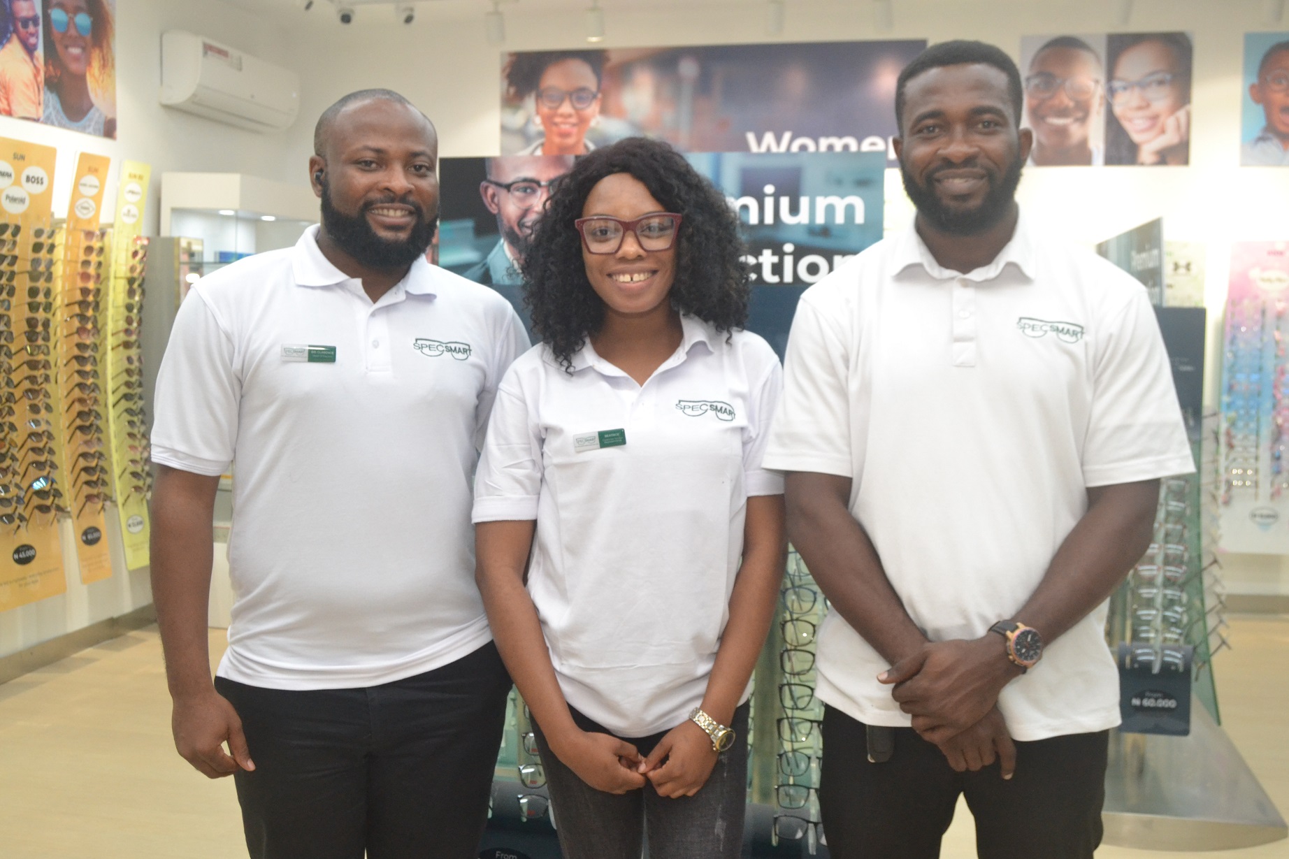 From Left: Dr. Clarence Nwokocha, Practice Head and Medical Director; with Ebosele Beatrice, Customer Service Representative; and Dr. Chinomso Ogbugh, Senior Optometrist, all of SpecSMART, at the opening of SpecSMART Clinic, at Ikoyi Plaza Mall, along Awolowo Road, Ikoyi, Lagos, on Wednesday, 17th August, 2022.