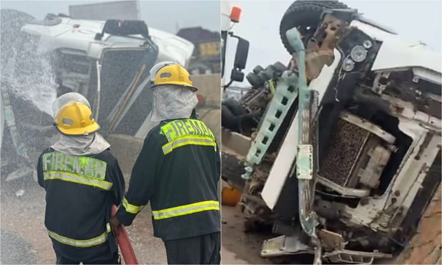 ‘The accident was due to reckless driving by the truck driver. No casualty was recorded but the tanker was damaged and fire service was able to save properties worth millions of naira’.