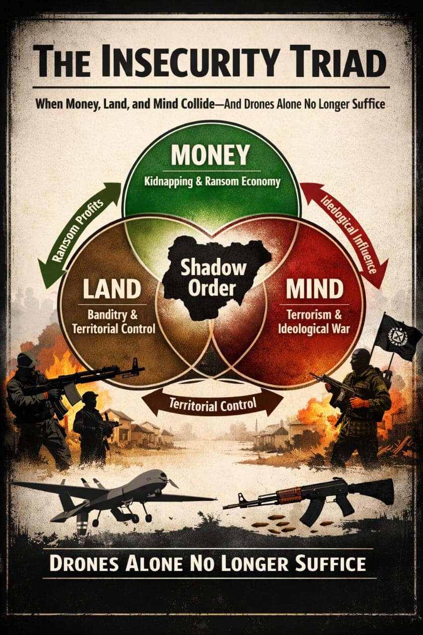 In The Sunday Stew, this inquiry has already traced the contours of kidnapping, banditry, and insurgency as distinct but increasingly interwoven forms of violence. The present analysis consolidates these patterns into a single explanatory framework — The Insecurity Triad — as a way of understanding their systemic interaction.