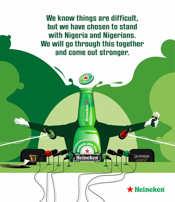 In the second meme, which interestingly was in the same tweet, a disproportionately big-sized caricature of Heineken is standing before a battery of microphones in what looks like a press conference. One will not miss the suggestion made in this image with the two unoccupied seats painted in Guinness colours and flanking Heineken as he stands, proclaiming rather emotionally that, “We know things are difficult, but we have chosen to stand with Nigeria and Nigerians. We will go through this together and come out stronger.”