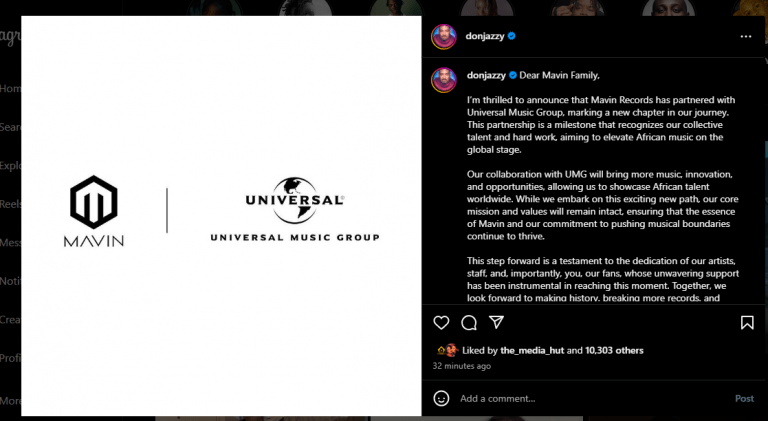 He wrote: “Dear Mavin Family, I’m thrilled to announce that Mavin Records has partnered with Universal Music Group, marking a new chapter in our journey. This partnership is a milestone that recognizes our collective talent and hard work, aiming to elevate African music on the global stage.